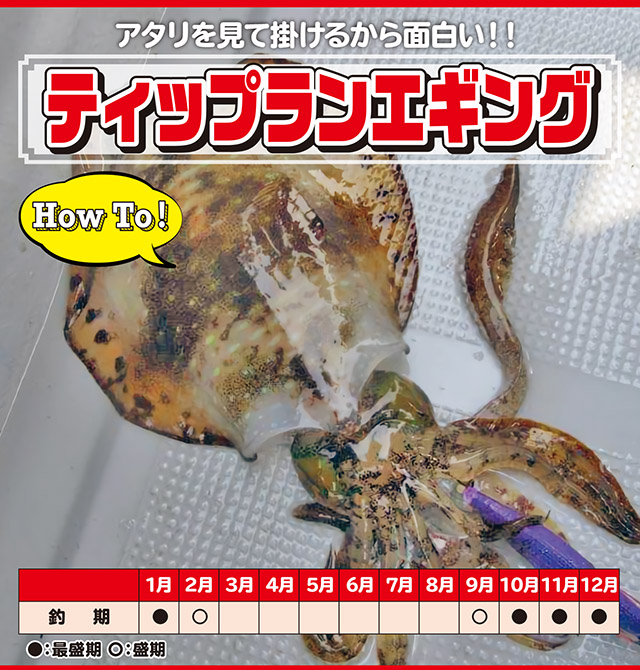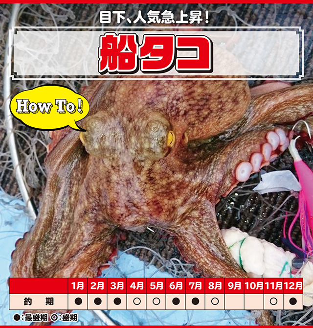 タコは海底でエサを探して捕食するので、しっかりと仕掛を海底にキープして探るのがポイント。海面まで巻き上げたら、船べりに張り付かれないよう注意が必要。