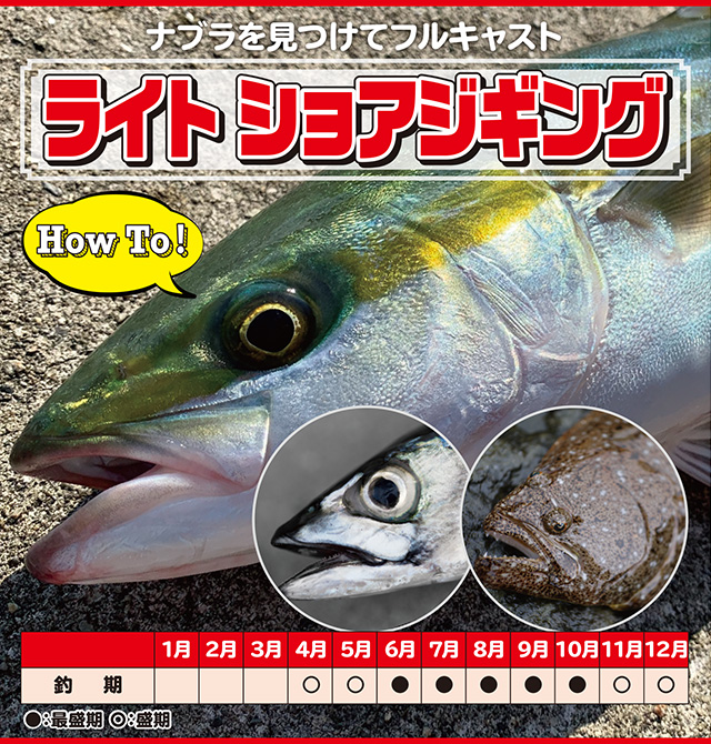 狙い方はスイミングやボトムを丹念に探るリフト&フォールが王道。夏~秋:メインのベイトはイワシ。スイミングが有効。