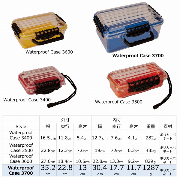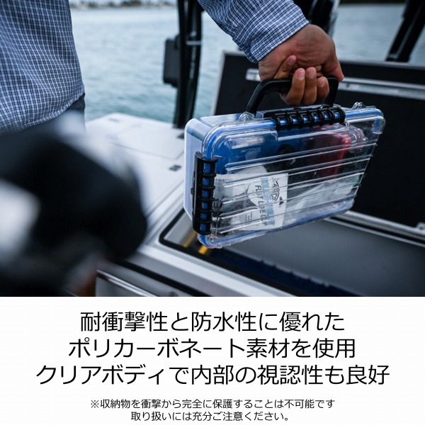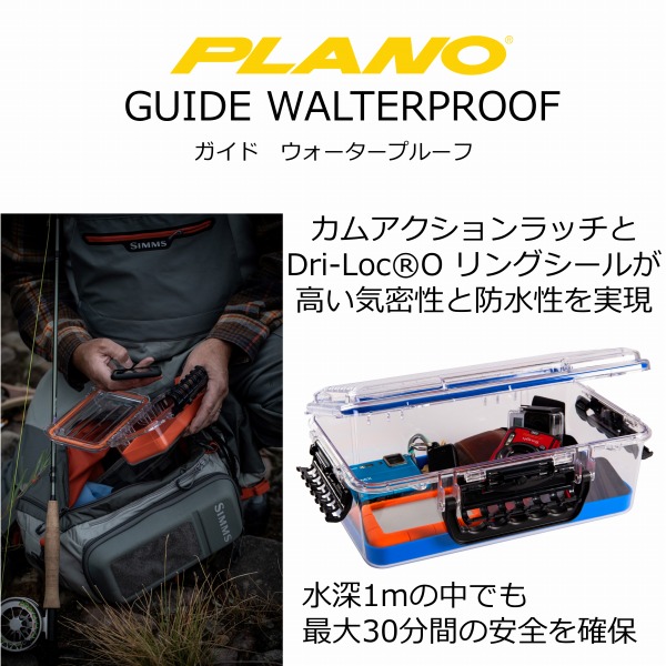 PLANO GUIDE SERIES ウォータープルーフ防水性能に特化した保護ケース。カムアクションラッチと、Dri-Loc O リングシールによって、高い気密性と防水環境を確保。釣りをはじめとした、水辺のアクティビティにおいて、貴重品を安心して携帯できる。万が一、ボックスごと水中に流れ出てしまった場合でも、内容物は水深1mの中で最大30分間は安全を保たれる。内側の滑り止めゴムパッドは、収納物がボックス内部で暴れるのを防ぎ、緩衝性もあるため損傷を防ぐ。本体には、耐衝撃性、耐衝撃性、防水性に優れたポリカーボネート素材を使用。透明度が高く、開けずに中身を識別できる。※収納物を衝撃から完全に保護することは不可能ですので、取り扱いには充分ご注意ください。