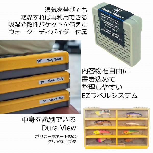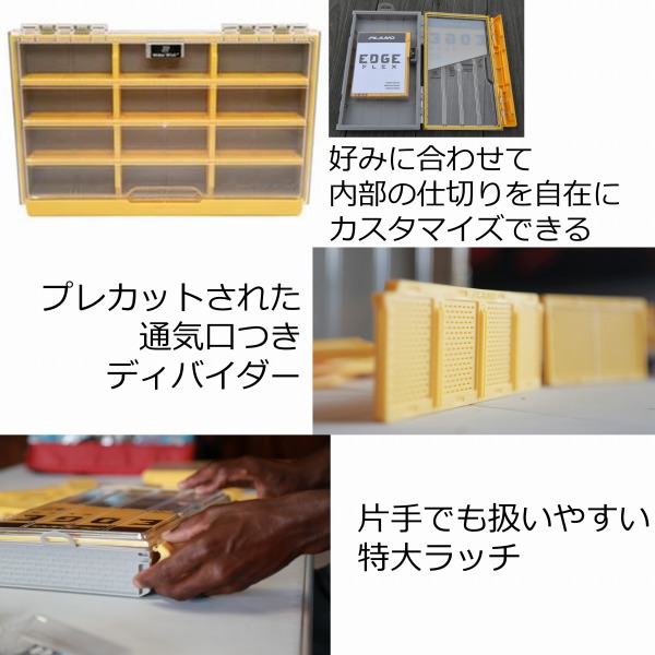 PLANO EDGE フレックス独自のディバイダーシステムを採用し、ユーザーの好みに合わせてカスタマイズ可能なタックルボックス。大、小、長、短と、内部構造をユーザーの好みに合わせて、仕切りをフレキシブルに組み合わせられる。組み合わせ次第で、ツールや大きなルアーと一緒に、シンカーやフックなどのターミナルタックルを、整理して1つのボックスに収納できる。FLEXディバイダーシステムの内容は、5枚の4X、6枚の3X、9枚の2X、18枚の1Xの、計38枚のディバイダー(中仕切り)。プレカットされた通気性のある仕切り、Dri-Loc防水シール、吸水性乾燥剤を備えており、ボックス内部の湿気を除去してサビを防ぐ。中身をすぐに識別できるDura View (透明なポリカーボネイト製の上蓋)や、片手で簡単に開閉できる特大ラッチで、使いやすさを追求。同サイズのユニットを複数積み重ねられるように設計され、システマチックな収納が可能。リブつきのフタとベース、スチール製のピンヒンジは、耐久性があり、掴みやすく、簡単に開閉できる。