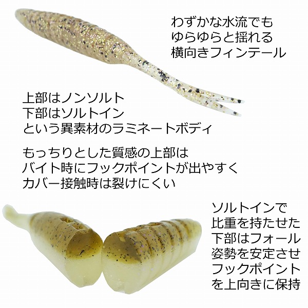 バンクフィッシングのスペシャリスト、三浦一真監修、揺らめくテールと、水平フォールにこだわったスティックベイト。水平姿勢をキープしながらスローフォールする一方で、スプリットテールが左右に揺れ動きバイトを誘う。フォールベイトとしての性能はもちろん、トゥイッチベイトとしてキレのある横方向の動きでも誘える。上部はノンソルト、下部はソルトインという異素材のラミネートボディ。もっちりとした質感の上部はバイト時にフックポイントが出やすく、カバー接触時は裂けにくい。ソルトインで比重を持たせた下部はフォール姿勢を安定させフックポイントを上向きに保持。8.3gという重量設計により、スピニング、ベイト、いずれのタックルでも快適にキャストできる。
