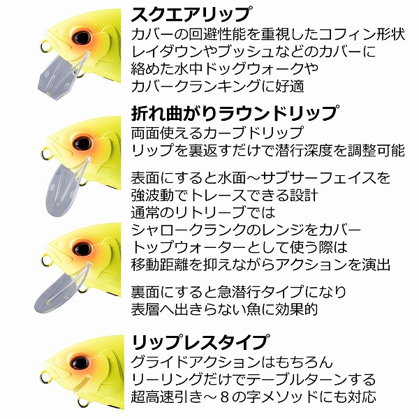 2種のリップ、3種のテール、そしてシンカーアイによって、10パターン以上のカスタムができる。