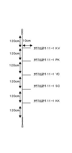 「カラフル針5」を使ったイカ釣プロサビキ11cmが登場!  配色解説:ヤリイカに強いKムラ系統(KK、KV)を2色とPKを選択し使用。選択的に乗る日があるSCやアピールの強いYCを使用し、澄み潮、濁り潮どちらでもムラなく乗せられる配色。※掲載している商品の画像は代表画像を表示しています。また実物と色が違って見える場合があります。あらかじめご了承下さい。