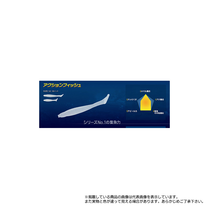 シリーズでもっとも高いアピール力を持つのが、このアクションフィッシュ。その大きなシャッドテールが放つ強烈過ぎる波動は、遥か遠くからメバルを呼び寄せることが可能。ただ、それでいてボディ本体の波動は非常にナチュラル。そのため、近寄ってきたメバルは躊躇なくワームを丸飲みにする。 そしてもうひとつ、アクションフィッシュには大きな特徴がある。それは「扱いやすさ」。難しい動作なしに、ただ巻きオンリーでターゲットを狙うことができ、また程よい引き抵抗によってルアーの状態をしっかりと把握できる。指で掴みやすい形状で、フックが刺しやすいのも特徴。こうした扱いやすさから、アクションフィッシュはライトゲーム入門者にも強くおすすめしたいモデルだ。 リグはジグヘッドリグでシンプルに、よりアピールさせたいときは1.8、バイトがあるが乗らないときなどは1.2を使うのが基本的な使用法。