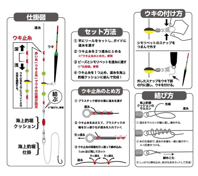これ一つで海上釣堀が楽しめる完全セットの青物用仕掛 釣場に着いたら道糸にウキ止め糸を結び、道糸と海上釣堀クッションのサルカンを結んでウキを取り付ければ釣りがスタート出来る完全セット。※掲載している商品の画像は代表画像を表示しています。また実物と色が違って見える場合があります。あらかじめご了承下さい。