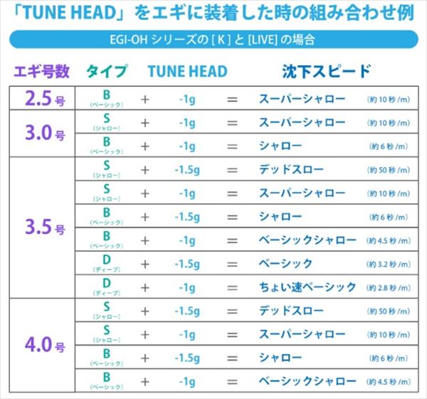 フロート素材を採用し、エギの沈下を遅くすることができる専用ヘッドパーツ!【シャローチューン】フロート素材を採用したヘッドパーツによって、様々なエギをシャローチューンに変更可能! 【視認性】視認性の高いカラーをラインナップしているため、様々な状況下でもエギが見やすくなる。【汎用性】エギ王シリーズはもちろん、様々なエギにも幅広く対応。【使用例】・エギ王 LIVE、エギ王 LIVE サーチ、エギ王 Kなど各エギ王シリーズに対応。・TRシンカー同様にチューンヘッドをエギの頭に被せシリコンバンドで固定して使用。・シャロータイプのラインナップにないカラーをシャロータイプにするのはもちろん、ベーシックタイプとシャロータイプの中間の沈下速度やベーシックタイプとディープタイプの中間の沈下速度に調整も可能。
