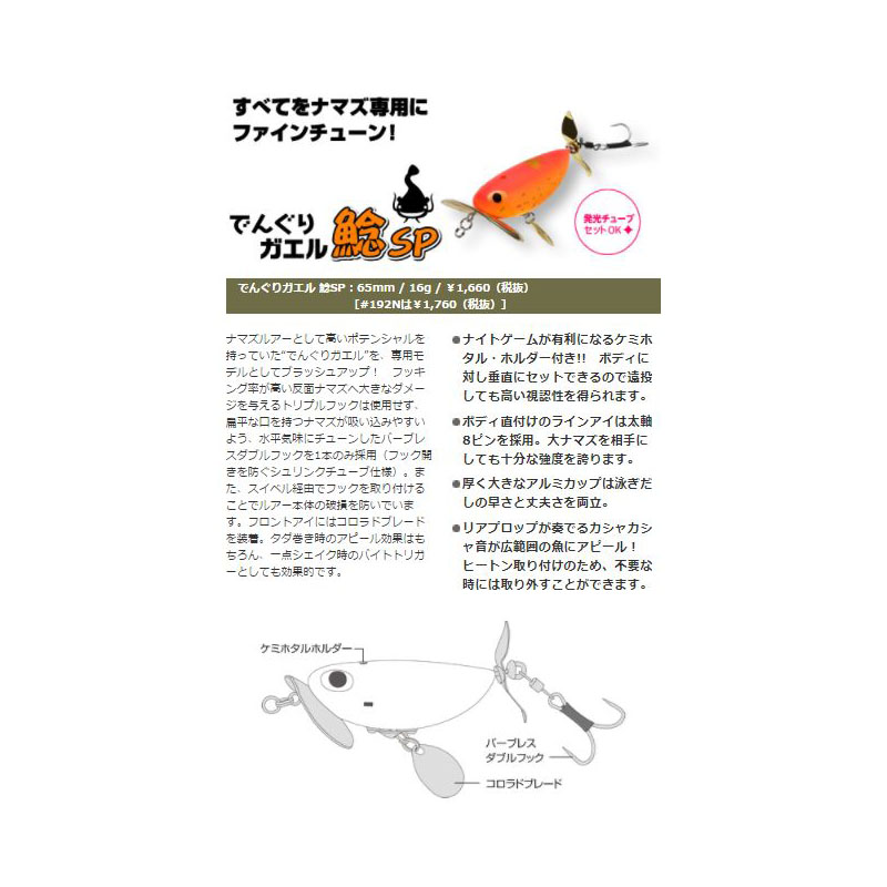 ナマズルアーとして高いポテンシャルを持っていた“でんぐりガエル”を、専用モデルとしてブラッシュアップ! フッキング率が高い反面ナマズへ大きなダメージを与えるトリプルフックは使用せず、扁平な口を持つナマズが吸い込みやすいよう、水平気味にチューンしたバーブレスダブルフックを1本のみ採用(フック開きを防ぐシュリンクチューブ仕様)。また、スイベル経由でフックを取り付けることでルアー本体の破損を防いでいます。フロントアイにはコロラドブレードを装着。タダ巻き時のアピール効果はもちろん、一点シェイク時のバイトトリガーとしても効果的です。