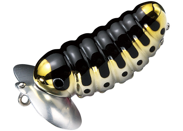 ナマズゲーム専用ノイジープラグ。ナマズ独特の意外と大きなバキューム系の捕食音「パスッ!」「パスッ!」「チュバ」「チュバ」と共に水面が割れ、ルアーが水中に引きずり込まれる醍醐味。ナマズをターゲットにしたエキサイティングなゲームをより一層楽しむためには、トップ系の攻略が基本路線。夕方以降活発に動き回るターゲットの「ナマズ」に対して存在感をアピールするために、キャタピーに求めたものは、ただ引き前提で水を動かし、音を出すルアーを使用する事により一層魚にアピールします。