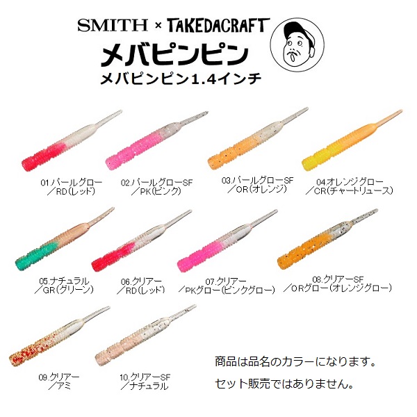 ライトゲーム界の奇才、武田栄氏プロデュース。スミスとTAKEDA CRAFTのコラボレーションで完成したメバル用ピンテールワームです。スローからファーストまでのレベルリトリーブ(タダ巻き)、フォールやボトム付近のズル引き、そして表層スキッピングやストップ&ゴーなどのアクションリトリーブなど万能タイプのピンテールモデル。手強い湾内メバルも意識したスマート&スモールデザイン!※掲載している商品の画像は代表画像を表示しています。また実物と色が違って見える場合があります。あらかじめご了承下さい。