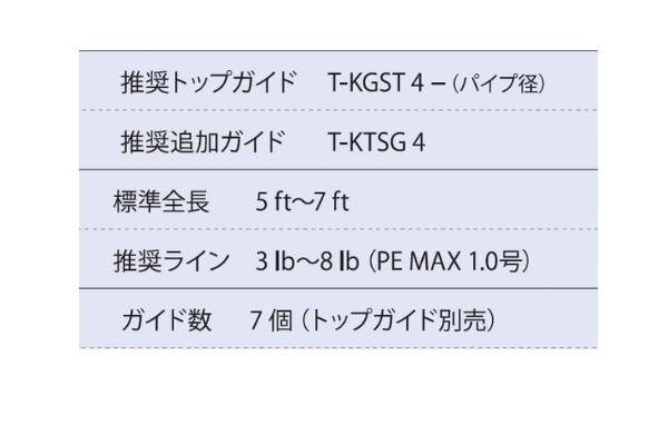 ガイド数:7個(トップガイド別売) 標準全長:5ft〜7ft 推奨ライン:3lb〜8lb(PE MAX1.0号) ※標準全長より長いブランクスの場合は、推奨ガイドをティップ部分に追加してください。