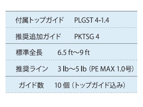 ガイド数:10個(トップガイド込み) 標準全長:6.5ft〜9ft 推奨ライン:3lb〜5lb(PE MAX1.0号) ※標準全長より長いブランクスの場合は、推奨ガイドをティップ部分に追加してください。