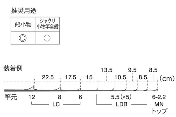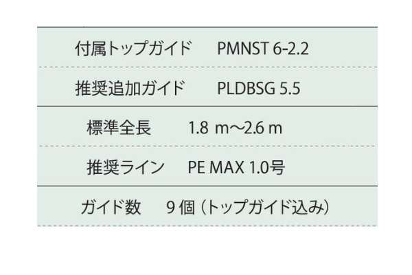 ガイド数:9個(トップガイド込み) 標準全長:1.8m〜2.6m 推奨ライン:PE MAX1.0号 ※標準全長より長いブランクスの場合は、推奨ガイドをティップ部分に追加してください。