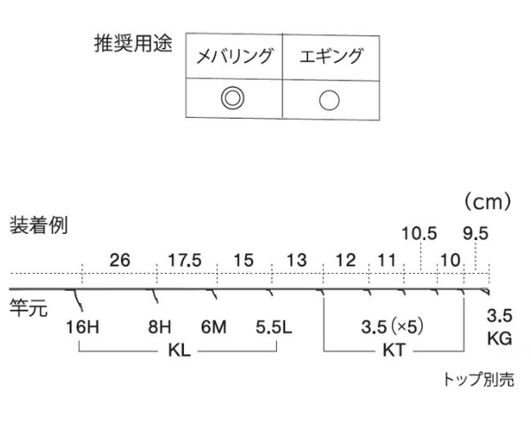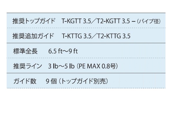 ガイド数:9個(トップガイド別売) 標準全長:6.5ft〜9ft 推奨ライン:3lb〜5lb(PE MAX0.8号) ※標準全長より長いブランクスの場合は、推奨ガイドをティップ部分に追加してください。