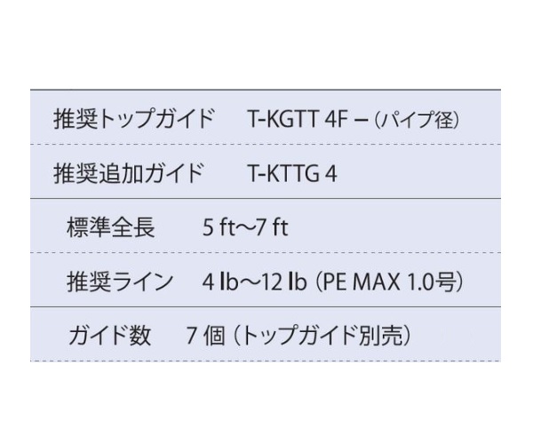 ガイド数:7個(トップガイド別売) 標準全長:5ft〜7ft 推奨ライン:4lb〜12lb(PE MAX1.0号) ※標準全長より長いブランクスの場合は、推奨ガイドをティップ部分に追加してください。