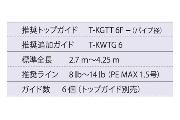 ガイド数:6個(トップガイド別売) 標準全長:2.7m〜4.25m 推奨ライン:8lb〜14lb(PE MAX1.5号) ※標準全長より長いブランクスの場合は、推奨ガイドをティップ部分に追加してください。