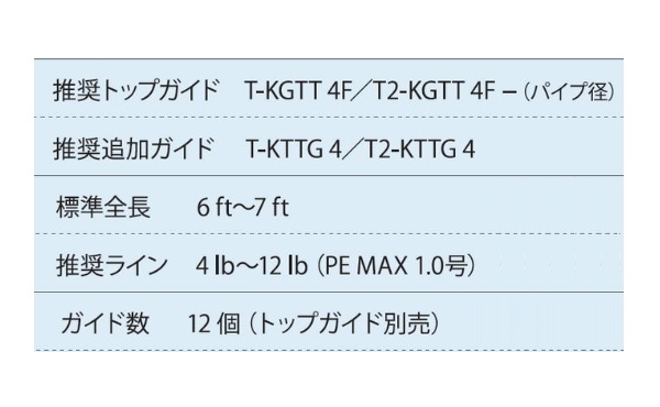 ガイド数:12個(トップガイド別売) 標準全長:6ft〜7ft 推奨ライン:4lb〜12lb(PE MAX1.0号) ※標準全長より長いブランクスの場合は、推奨ガイドをティップ部分に追加してください。