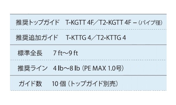 ガイド数:10個(トップガイド別売) 標準全長:7ft〜9ft 推奨ライン:4lb〜8lb(PE MAX1.0号) ※標準全長より長いブランクスの場合は、推奨ガイドをティップ部分に追加してください。