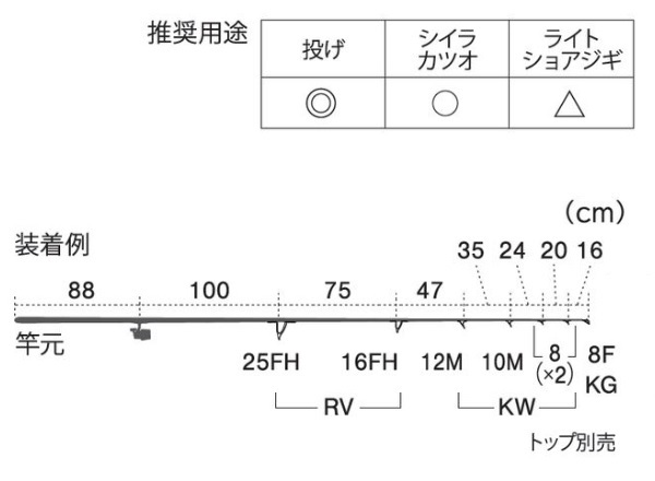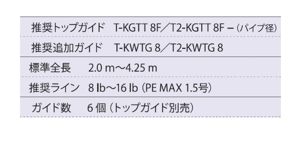 ガイド数:6個(トップガイド別売) 標準全長:2.0m〜4.25m 推奨ライン:8lb〜16lb(PE MAX1.5号) ※標準全長より長いブランクスの場合は、推奨ガイドをティップ部分に追加してください。
