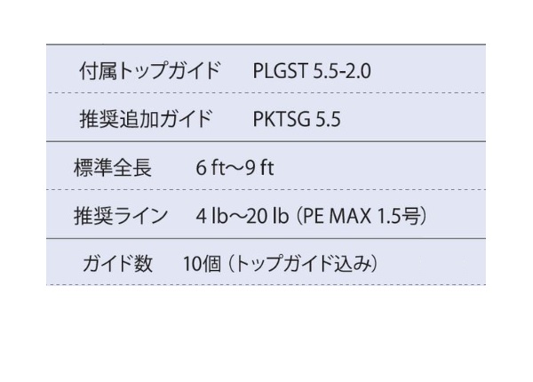 ガイド数:10個(トップガイド込み) 標準全長:6ft〜9ft 推奨ライン:4lb〜20lb(PE MAX1.5号) ※標準全長より長いブランクスの場合は、推奨ガイドをティップ部分に追加してください。