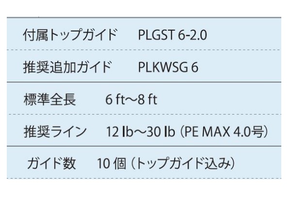 ガイド数:10個(トップガイド込み) 標準全長:6ft〜8ft 推奨ライン:12lb〜30lb(PE MAX4.0号) ※標準全長より長いブランクスの場合は、推奨ガイドをティップ部分に追加してください。