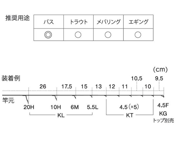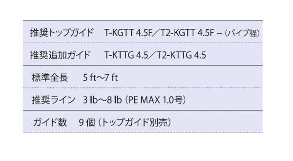 ガイド数:9個(トップガイド別売) 標準全長:5ft〜7ft 推奨ライン:3lb〜8lb(PE MAX1.0号) ※標準全長より長いブランクスの場合は、推奨ガイドをティップ部分に追加してください。