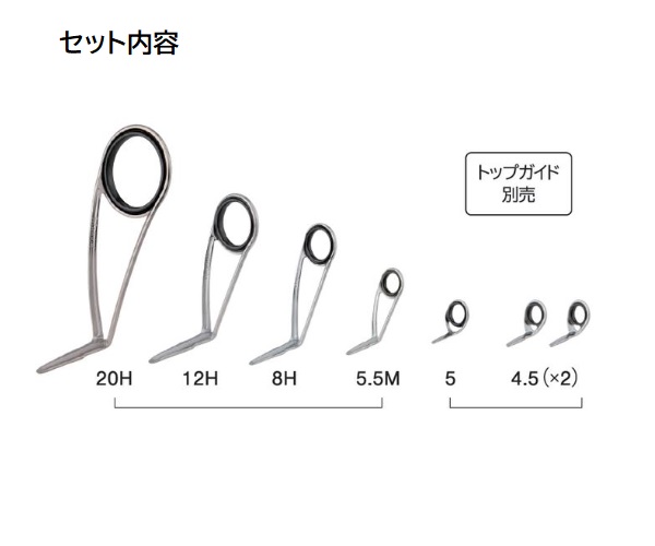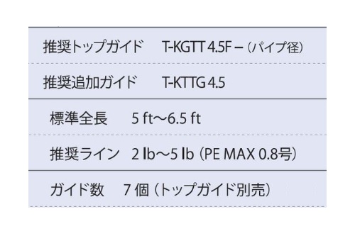 ガイド数:7個(トップガイド別売) 標準全長:5ft〜6.5ft 推奨ライン:2lb〜5lb(PE MAX0.8号) ※標準全長より長いブランクスの場合は、推奨ガイドをティップ部分に追加してください。