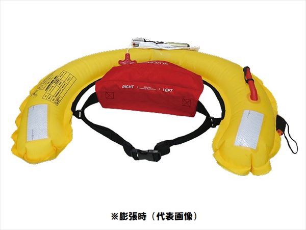 初期浮力:約9.0kg、 充気装置 / Inflator:ハルキーロバーツ HR 6F、 生地:ポリエステル420D 、 ウエスト:70〜100cm、 小型船舶用救命胴衣 Type A 国土交通省型式承認品自動膨張特集