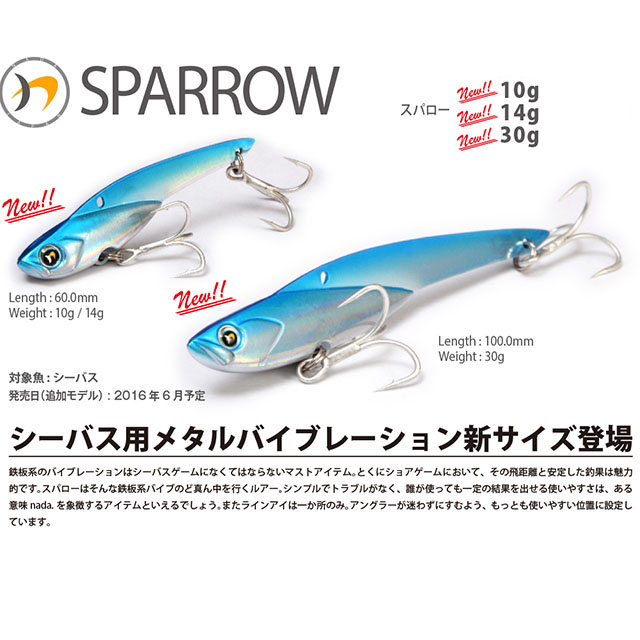 鉄板系のバイブレーションはシーバスゲームになくてはならないマストアイテム。とくにショアゲームにおいて、その飛距離と安定した釣果は魅力的です。スパローはそんな鉄板系バイブのど真ん中を行くルアー。シンプルでトラブルがなく、誰が使っても一定の結果を出せる使いやすさは、ある意味nadarを象徴するアイテムといえるでしょう。ラインアイは一か所のみ。アングラーが迷わずにすむよう、もっとも使いやすい位置に設定しています。