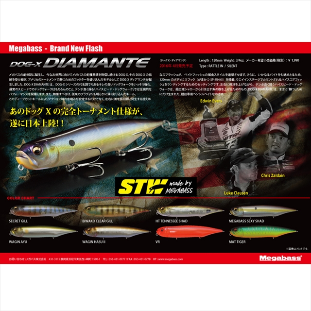 メガバスの創世記に誕生し、今なお世界に向けてメガバスの釣獲思想を発信し続けるDOG-X。そのDOG-Xの伝統を受け継ぎ、アメリカのトーナメントで勝つためのファクターを盛り込んだモデルとしてDOG-Xディアマンテが誕生しました。DOG-X DIAMANTEは、DOG-Xシリーズの代名詞でもあるキレの良いドッグウォークをいっそう強化。通常のスピードでのドッグウォークはもちろんのこと、テンポ良く探る「ハイスピード・ドッグウォーク」では圧倒的なパフォーマンスを発揮します。また、特筆すべきは、従来のプラグよりも明ら※掲載している商品の画像は代表画像を表示しています。また実物と色が違って見える場合があります。あらかじめご了承下さい。