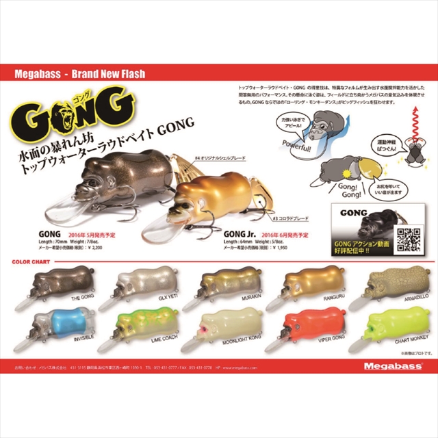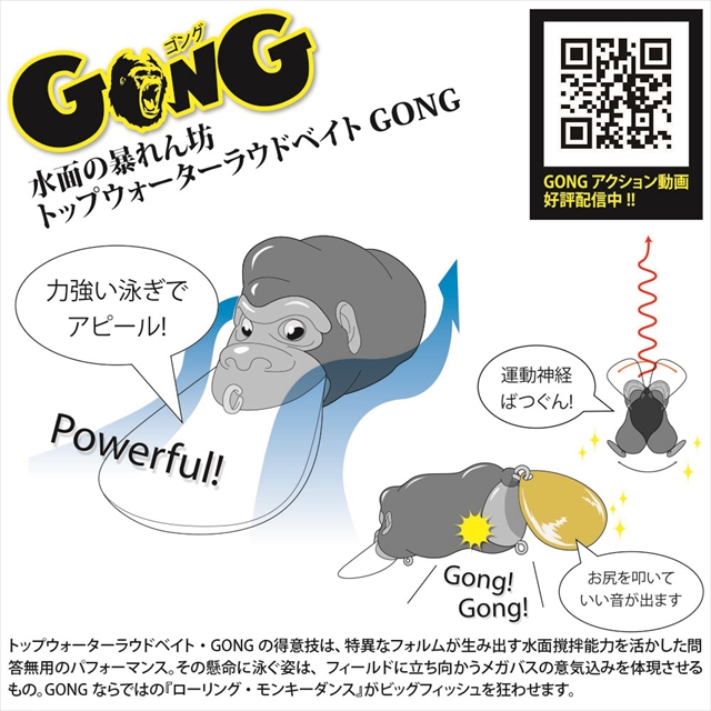 トップウォーターラウドベイト・GONGの得意技は、特異なフォルムが生み出す水面撹拌能力を活かした問答無用のパフォーマンス。その懸命に泳ぐ姿は、フィールドに立ち向かうメガバスの意気込みを体現させるもの。GONGならではの「ローリング・モンキーダンス」がビッグフィッシュを狂わせます。※掲載している商品の画像は代表画像を表示しています。また実物と色が違って見える場合があります。あらかじめご了承下さい。