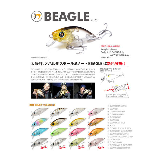 ライトソルトミノー・ビーグルは F(フローティング)と SS(スローシンキング)の2タイプ。メインターゲットとなる夜間のメバルゲームを想定し、スロースピードにおける安定したスイムアクションと泳ぎだしのレスポンスを重視しています。また、あえてファット感を出したボディ形状は飛距離も十分、特殊なタックルを使わずともメバルゲームを楽しむことが可能です。もちろん、メバル以外にもメッキ、カマス、セイゴなどライトターゲット全般に効果を発揮します。