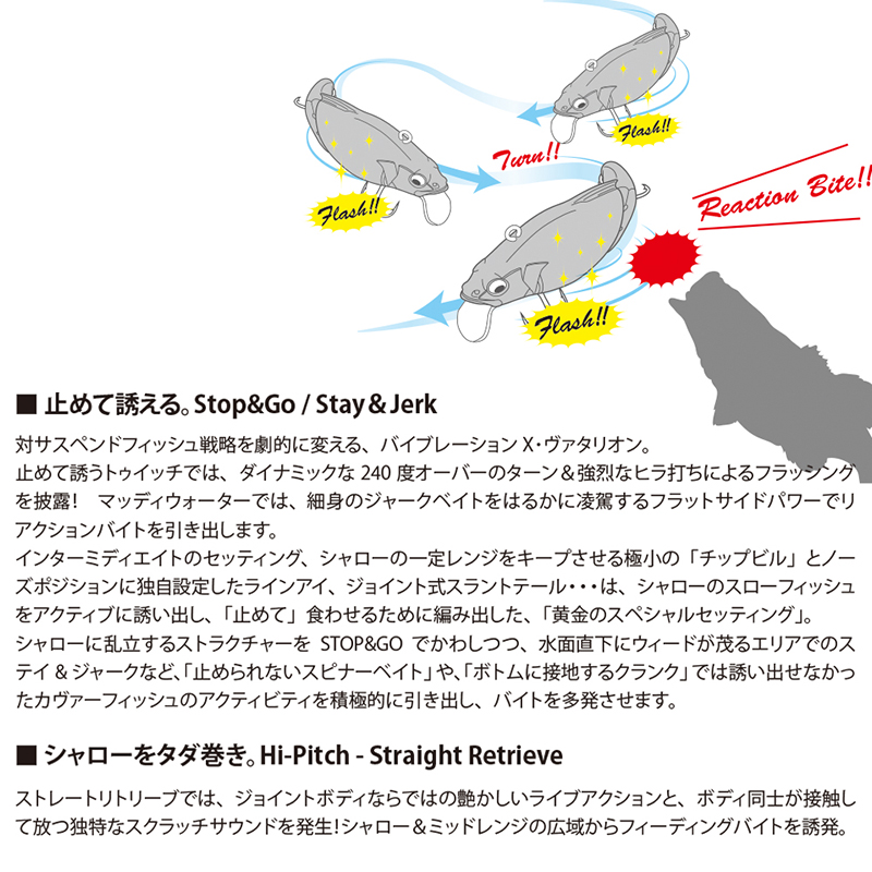 止めて誘える。Stop&Go / Stay&Jerk対サスペンドフィッシュ戦略を劇的に変える、バイブレーションX・ヴァタリオン。止めて誘うトゥイッチでは、ダイナミックな240度オーバーのターン&強烈なヒラ打ちによるフラッシングを披露! マッディウォーターでは、細身のジャークベイトをはるかに凌駕するフラットサイドパワーでリアクションバイトを引き出します。インターミディエイトのセッティング、シャローの一定レンジをキープさせる極小の「チップビル」とノーズポジションに独自設定したラインアイ、ジョイント式スラントテール・・・は、シャローのスローフィッシュをアクティブに誘い出し、「止めて」食わせるために編み出した、「黄金のスペシャルセッティング」。シャローに乱立するストラクチャーをSTOP&GOでかわしつつ、水面直下にウィードが茂るエリアでのステイ&ジャークなど、「止められないスピナーベイト」や、「ボトムに接地するクランク」では誘い出せなかったカヴァーフィッシュのアクティビティを積極的に引き出し、バイトを多発させます。シャローをタダ巻き。Hi-Pitch - Straight Retrieveストレートリトリーブでは、ジョイントボディならではの艶かしいライブアクションと、ボディ同士が接触して放つ独特なスクラッチサウンドを発生!シャロー&ミッドレンジの広域からフィーディングバイトを誘発。