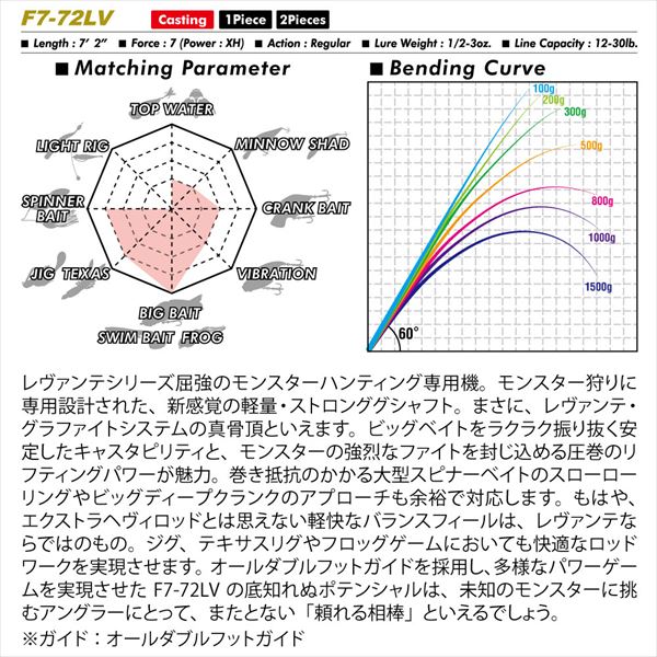 バスロッドのファーストエディションが、革命を起こす。「レヴァンテ」ついに日本上陸!クリス・ザルディンの名刀が、ニッポンを斬る。レヴァンテシリーズ屈強のモンスターハンティング専用機。モンスター狩りに専用設計された、新感覚の軽量・ストロンググシャフト。まさに、レヴァンテ・ グラファイトシステムの真骨頂といえます。ビッグベイトをラクラク振り抜く安定したキャスタピリティと、モンスターの強烈なファイトを封じ込める圧巻のリフティングパワーが魅力。巻き抵抗のかかる大型スピナーベイトのスローローリングやビッグディープクランクのアプローチも余裕で対応します。もはや、エクストラヘヴィロッドとは思えない軽快なバランスフィールは、レヴァンテならではのもの。ジグ、テキサスリグやフロッグゲームにおいても快適なロッドワークを実現させます。オールダブルフットガイドを採用し、多様なパワーゲームを実現させたF7-72LV の底知れぬポテンシャルは、未知のモンスターに挑むアングラーにとって、またとない「頼れる相棒」といえるでしょう。※ガイド:オールダブルフットガイド(2019年発売モデル)※掲載している商品の画像は代表画像を表示しています。また実物と色が違って見える場合があります。あらかじめご了承下さい。