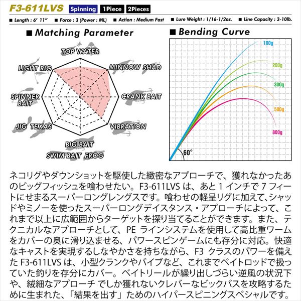 全長:6フィート11インチ パワー:F3(mL) アクション:MEDIUMFast ルアー:1/16-1/2oz. ライン:3-10lb. 品番:SP JP(2019) 2ピースs F3-611LVS 2P 継数:2ピース