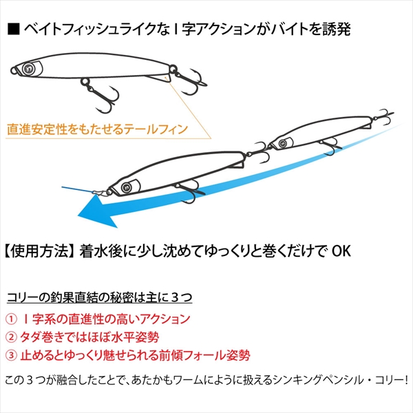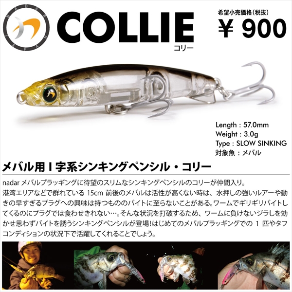 nadar メバルプラッギングに待望のスリムなシンキングペンシルのコリーが仲間入り。港湾エリアなどで群れている15cm 前後のメバルは活性が高くない時は、水押しの強いルアーや動きの早すぎるプラグへの興味は持つもののバイトに至らないことがある。ワームでギリギリバイトしてくるのにプラグでは食わせきれない…。そんな状況を打破するため、ワームに負けないジラしを効かせ思わずバイトを誘うシンキングペンシルが登場!はじめてのメバルプラッギングでの1 匹やタフコンディションの状況下で活躍してくれることでしょう。※掲載している商品の画像は代表画像を表示しています。また実物と色が違って見える場合があります。あらかじめご了承下さい。