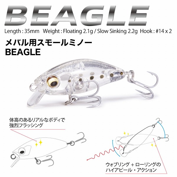 ライトソルトミノー・ビーグルはF(フローティング)とSS(スローシンキング)の2タイプ。メインターゲットとなる夜間のメバルゲームを想定し、スロースピードにおける安定したスイムアクションと泳ぎだしのレスポンスを重視した専用設計です。また、従来の一般的なミノーよりもボリュームアップしたボディは飛距離も十分。特殊なタックルを使わずとも、メバルゲームを手軽に楽しむことができます。メバル以外にもメッキ、カマス、セイゴなどライトターゲット全般に効果を発揮する万能選手です。※掲載している商品の画像は代表画像を表示しています。また実物と色が違って見える場合があります。あらかじめご了承下さい。