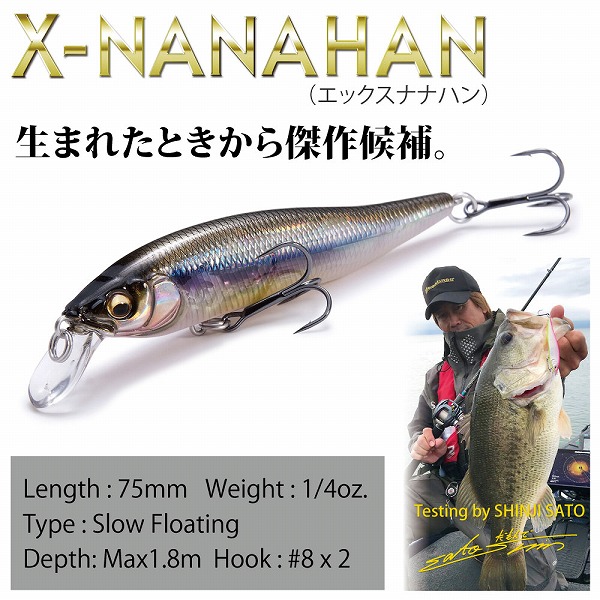 日本屈指のハードルアーの使い手である佐藤信治の理想と、ONETENなど世界を席巻するジャークベイトの数々を生み出してきたルアーデザイナー伊東由樹のエンジニアリングが融合。小型ミノーのロングキャスタビリティを追求するため、内部容積を確保すべく高体積のスクエアブロックから緻密にカービングされたボディは、視覚的なタイトシルエットを両立させて獲得。空気抵抗を徹底的に低減化し、70mmクラスのミノーにおける標準的な飛距離を凌駕する圧倒的なロングディスタンスキャスタビリティを実現しました。最新のハイドロダイナミクスを融合した特異なミノーシェイプは卓越したスイミングレスポンスと快適な操作性を発揮。NANAHANボディが生み出す軽妙なアクションは、ベイトフィッシュの微小な波動と明滅感を極めてリアルに再現。トゥイッチでは、わずかなロッドストロークで瞬時に軽快なダートを披露。レスポンシビリティの「極み」を追求した次世代のフィネス・ミノーがX-NANAHANです。※掲載している商品の画像は代表画像を表示しています。また実物と色が違って見える場合があります。あらかじめご了承下さい。