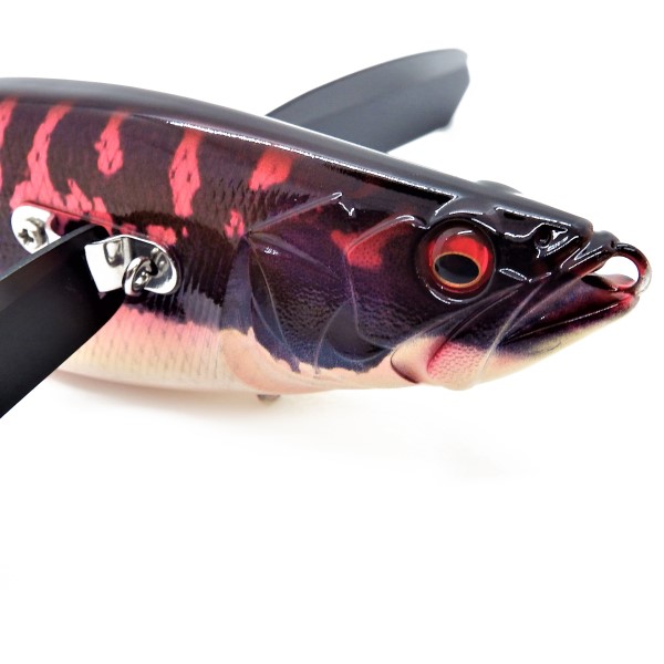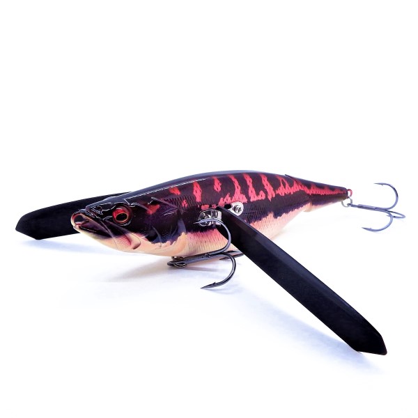 ■高速リトリーブでは、ボディは水面から剥離する「ホバリング状態」となり、ビッグボディを感じさせない軽やかなバジングを披露。 ウィングアクションと連動して作動する内臓されたR.A.B(Rudder Action Balancer System PAT.)は、ボディ内で舵切りアクションを発生させ、ジョインテッドテールをしなやかにテールウォークさせながらワンテンポ遅れたディレイサウンドを発生。遠く離れたターゲットを確実に刺激して訴求。