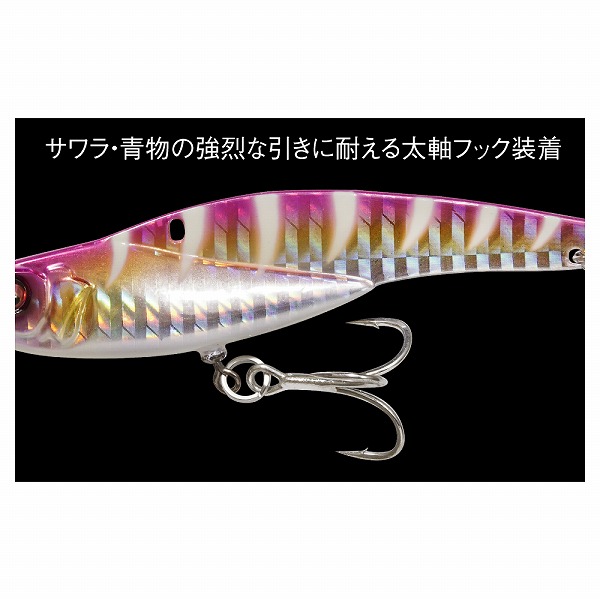 オニマルは海洋魚類の行動学による研究とテストの経験則によって、特別なバランスセッティングが施されたメタルバイブレーションの最終回答。逃走する鰯が見せるボディのレイラインをくっきりと浮かび上がらせることで、線視力に優れたシーバスや青物から最も捕食対象とされやすい、「被捕食体」としての要素をクローズアップ。逃走する小魚のシルエットを忠実にイミテートした水平スイミング姿勢は、いかなる速度においても一定のロール軸を保持し、生命感あふれるハイピッチバイブレーションを発生。ベイトフィッシュを追い回すフィッシュイーターの捕食本能を猛烈に刺激します。スイベル化したフロントアイは、ファイト中の捻りやエラ洗いへの追従性を向上させバラシを大幅に軽減。さらに、ラインアイポジション、フックポジション、ボディ形状、ウエイトバランス等を突き詰めた設計により、ラインやボディへのフック絡みのトラブルを徹底的に抑えています。シーバスはもちろん、クロダイやフラットフィッシュ、青物など、全てのソルトウォーターターゲットにアジャストする究極のサーチベイトです。