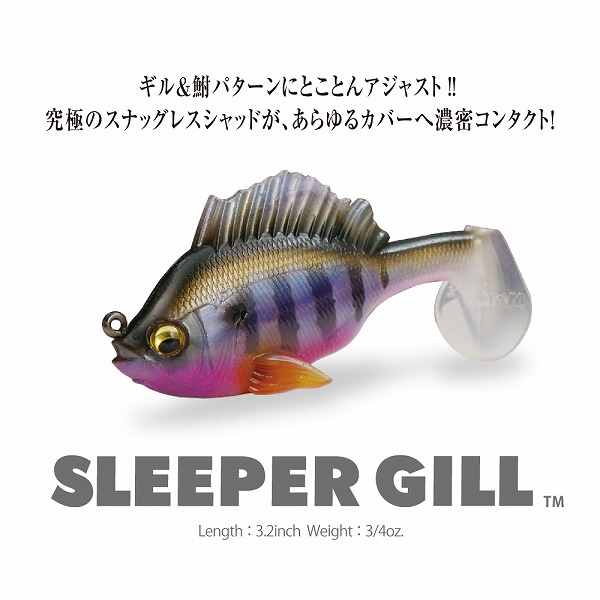 ギルパターンや鮒パターンでは、幅広ベイトを捕食中のバスに対し、通常のスイムベイトやファストムービングルアーでは誘いきれない状況があります。そんな時、スリーパーギルは、超スロームービングによる濃密な喰わせのコンタクトを成立させます。入り組んだレイダウン、カヴァーブッシュ、ウィードボトムエリアやリザーバーのティンバーやボトムスタンプ等、スタックが多発しそうなエリアを舐め尽くす、濃密なスキャンが可能。スリーパーフックデザインのスナッグレス&スイムボディが生み出す艶めかしいリアルアクションは、小さなブルーギルや鮒の姿をしたメガバス流のスイムジグと考えて良いでしょう。
