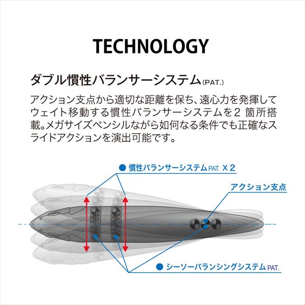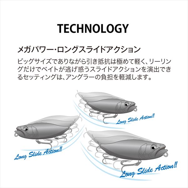 モンスターをフィーディングへと狂わせるミラクルベイトMEGADOG-Xは、大型ベイトを捕食するステージにおいて、戦略的なフィーディングゲームを可能としています。「表層のベイトがプレデターからターゲットとして選別される要素は何か?」について、海洋水産研究施設をはじめ、様々な視点から得たメガバス独自の研究成果をMEGADOGシリーズにはふんだんに盛り込んでいます。MEGADOG-Xの秘めたるポテンシャリティは、ビッグベイトゲームを一層手軽でエキサイティングな釣りへと変えていきます。