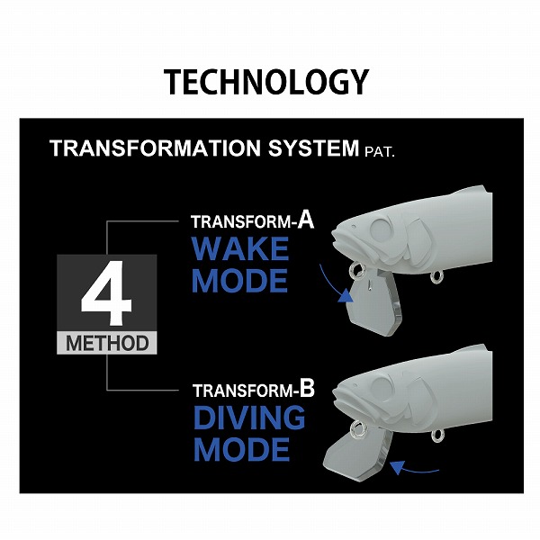 SuWITCHはXPODより導入されたアイティオーテクノロジー、「トランスフォーメーションシステム」(PAT.)を搭載。ひとつのルアーに複数のキャラクターを与える画期的なシステムは、ワンタッチでリップの角度を変更でき、ターゲットレンジと効果的なアクションについて瞬時のスイッチングを可能としています。Suは4を意味します。文字通り「4人の魔女」を内包する「SuWITCH」は、ひとつのルアーで4つの魔力を発する多様な破壊力を秘めています。状況に合わせた潜行レンジとアクションのスイッチを可能とし、プレデターにスイッチを入れる、新世代のマルチパーパス・スイムベイトです。スイムベイトでは世界初となるワンタッチによるリップ調整機構「2段階可変ビル」を搭載。水面での「ウェイクモード」と水中での「ダイビングモード」を瞬時に切り替えられます。さらにそれぞれのモードに対し、「リトリーブ」での誘いとトゥイッチやジャークを組み合わせた「ロッドワーク」による誘いが可能。ひとつのルアーで4つのアピール特性が異なるアクションを生み出せます。