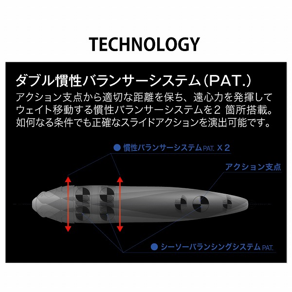 DOG-X DIAMANTE SWは、シーバスなど表層を意識したソルトウォーターターゲットに圧倒的なフィーディングインパクトを発揮。だれにでも容易に180°オーバーのテーブルターン・ドッグウォーク、ロングスケーティングが操作可能。広範囲に逃げ惑うベイトを多彩に演出します。深く彫り込んだディープカットキールがアクションレスポンスを鋭く高め、ライブリーなスプラッシュを発生。フィーディングを促進します。空気抵抗を徹底的に抑えたボディフォルムと、オリジナル・ディアマンテよりも大幅にウエイトアップした独自のセッティングにより、海や河口域に吹き晒す、向かい爆風時でも圧巻のロングキャスタビリティで立ち向かえます。海のトップウォーターゲームを変えるDOG-X DIAMANTE SWが、さらなるエキサイティングなドラマを生み出します。