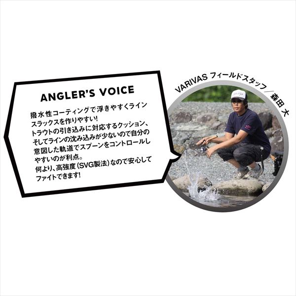 トーナメントユースを追求したナイロン素材「SVG」(スーパーVA-G)を採用。強度面・耐久性ともにハイクラスのエリアトラウト専用ナイロンラインです。紫外線に強いノンストレスコーティングにより、長期間安定した強度をキープします。高い撥水性能を誇るSP-Vコーティングを施すことで、キャスタビリティUP! 飛距離面でも大きなアドバンテージとなります。また、ラインの吸水劣化を抑え耐久性も向上します。VARIVASが誇る高強度製法VA-G製法をブラッシュアップ。強度面をさらに向上させたSVG製法により、トーナメントシーンのハードなファイトを耐え抜きます。