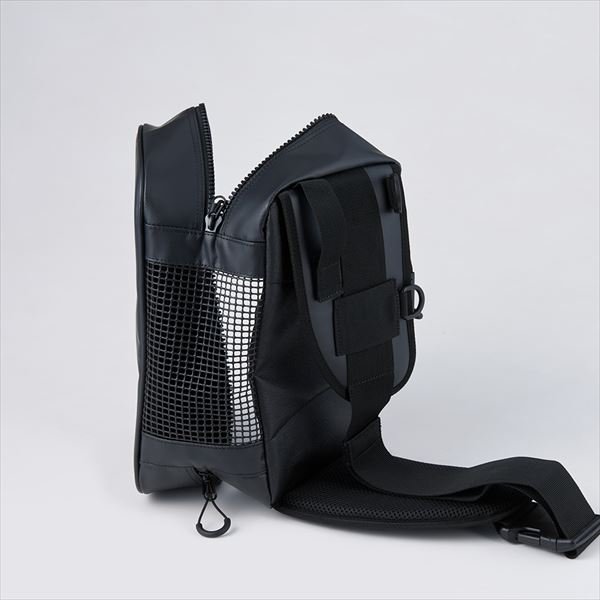 本体は水分を含まないターポリン、底面はバック内の水捌けを考慮したフルメッシュ仕様。後方でのケース出し入れが容易に行えるフルオープン仕様。バッグ中央にはファスナー全開を防止するスライダー固定用ナスカンを装備。装着しながらサイズ調整が可能な片側アジャスター、背面パットには滑り止め素材を使用。VS-3010NDMが2ケースゆったり収納可能。