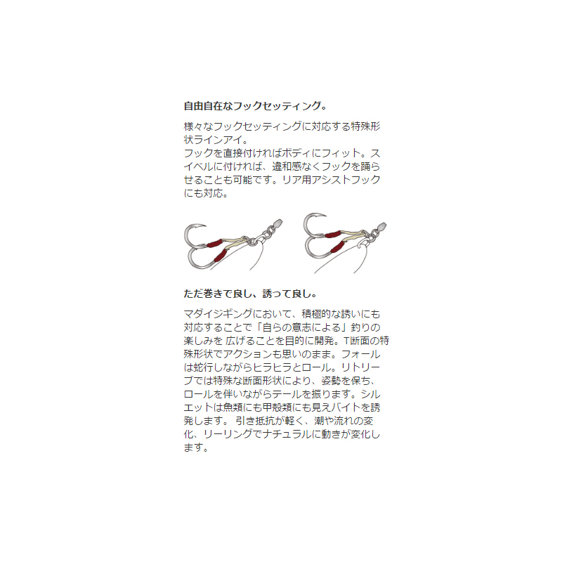 マダイジギング専用開発!!T断面の特殊形状でアクションも思いのまま。フォールは蛇行しながらヒラヒラとロール。リトリーブでは特殊な断面形状により、姿勢を保ち、ロールを伴いながらテールを振ります。シルエットは魚類にも甲殻類にも見えバイトを誘発します。引き抵抗が軽く、潮や流れの変化、リーリングでナチュラルに動きが変化します。自由自在のフックセッティング。様々なフックセッティングに対応する特殊形状ラインアイ。フックを直接付ければ、ボディにフィット。スイベルに付ければ、違和感なくフックを躍らせることも可能です。リア用アシストフックに対応。縦、横、斜め攻め方も自由自在。キャスト後は底を取り、ただ巻きが基本。カウントダウンでレンジキープ。ボトムや中層を、縦、横、斜めにスイミングさせ、早巻きや、ゆっくりとした誘いのバリエーションも有効です。その日の活性にあう、レンジ、リトリーブスピード、アクションが自由な演出が可能です。