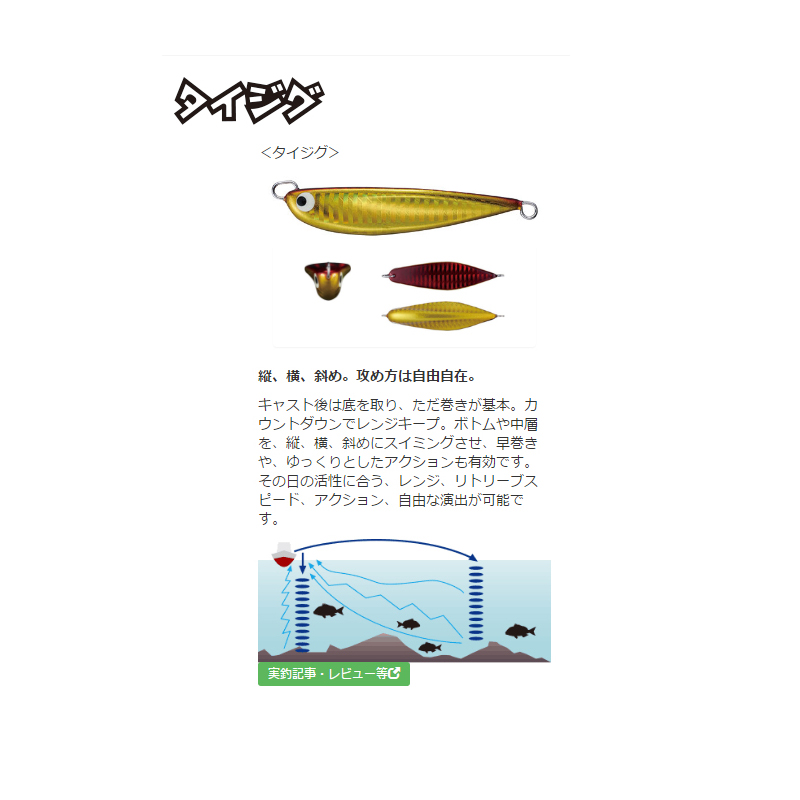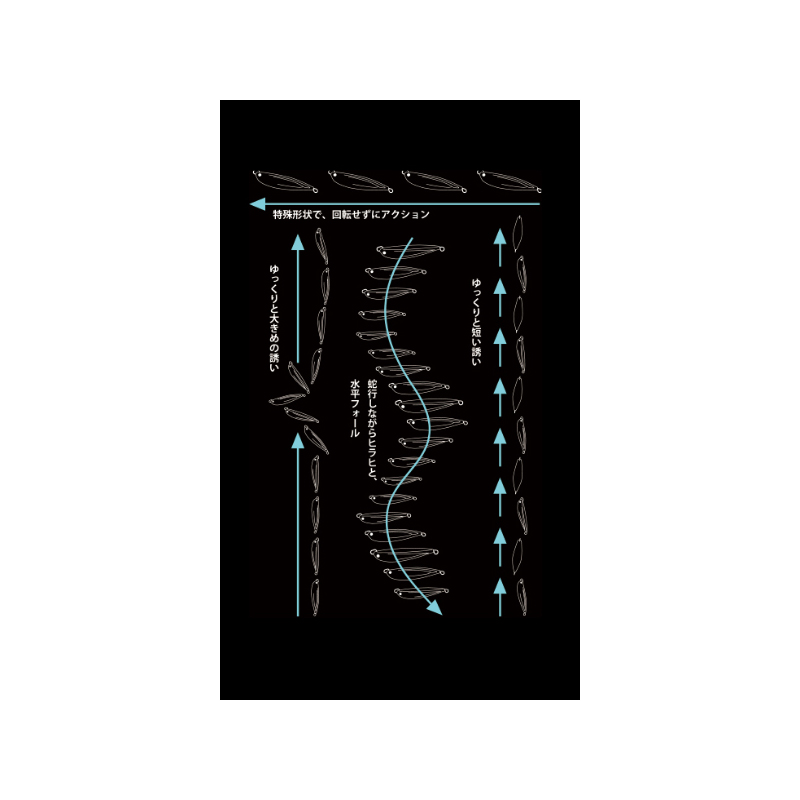 マダイジギング専用開発!!T断面の特殊形状でアクションも思いのまま。フォールは蛇行しながらヒラヒラとロール。リトリーブでは特殊な断面形状により、姿勢を保ち、ロールを伴いながらテールを振ります。シルエットは魚類にも甲殻類にも見えバイトを誘発します。引き抵抗が軽く、潮や流れの変化、リーリングでナチュラルに動きが変化します。自由自在のフックセッティング。様々なフックセッティングに対応する特殊形状ラインアイ。フックを直接付ければ、ボディにフィット。スイベルに付ければ、違和感なくフックを躍らせることも可能です。リア用アシストフックに対応。縦、横、斜め攻め方も自由自在。キャスト後は底を取り、ただ巻きが基本。カウントダウンでレンジキープ。ボトムや中層を、縦、横、斜めにスイミングさせ、早巻きや、ゆっくりとした誘いのバリエーションも有効です。その日の活性にあう、レンジ、リトリーブスピード、アクションが自由な演出が可能です。