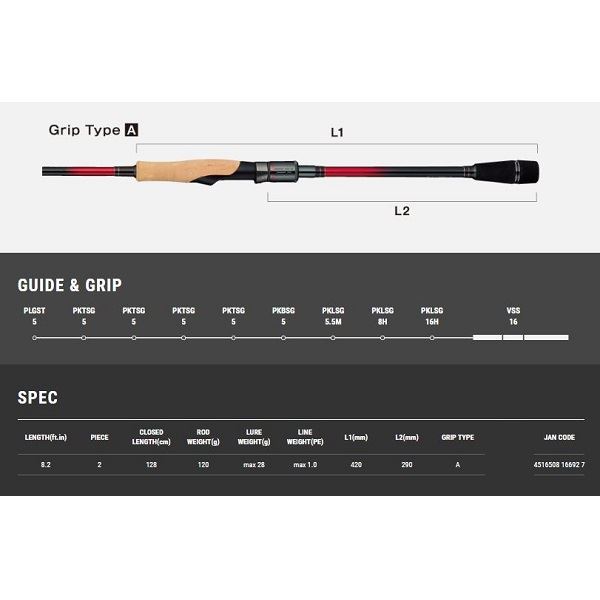 全長:8ft2inc 継数:2ピース CLOSEDサイズ:128cm ロッドウエイト:120g ルアーMAX:28g ラインMAX:1.0PE L1:420mm L2:290mm ※実物と色が違って見える場合があります。あらかじめご了承下さい。