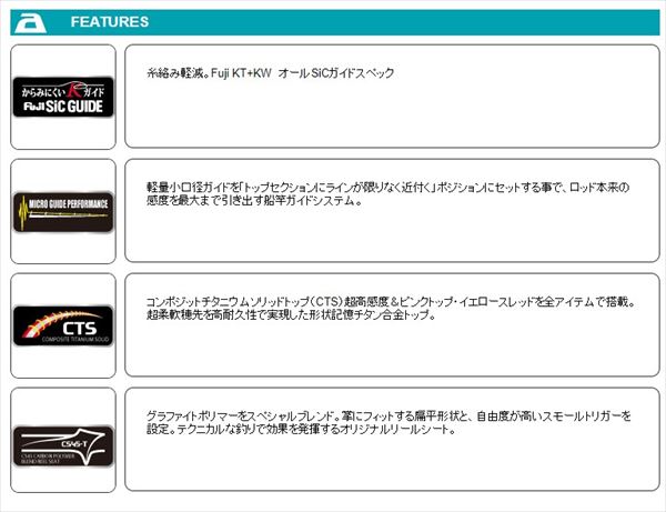 ティップまで張りを持たせたシリーズ一番の「攻め」モデル。ショートレングス&全身に張りを持たせたアクションが生む「極上の操作性」。硬調チタントップがワッペンサイズの極小アタリを的確に捕え、確実に掛ける。数釣りに焦点を合わせたトーナメント対応モデルは宙釣りの激しいタタキもカバー。シビアな状況を積極的に攻める、サブネーム「ハードノッカー」●ショートレングスとチタン製硬調穂先が生み出す「尖った感度」と「極上の操作性」●ワッペンサイズの極小アタリも的確に捕え、積極的に掛けていくトーナメント仕様 ●独自のティップアクションで目感度抜群 ●超高感度の形状記憶チタン合金トップCTS