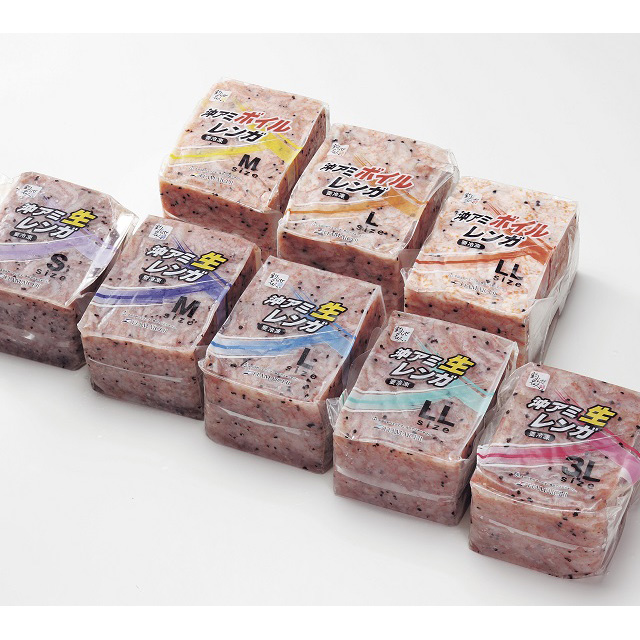 沖レンガ Mは、南極で獲れた身のしまった上質の白手オキアミの原版(約12s原反)を1/20カット(約600g)し真空包装しています。5つのサイズ(3L・LL・L・M・S)は磯・船・波止など様々なフィールドに対応するラインナップです。  対象魚:メジナ(グレ/クロ/クロメジナ)・チヌ(クロダイ/黒鯛)・マダイ(真鯛/鯛)・カツオ(本カツオ/すじカツオ)・マグロ(本マグロ/しび/キハダマグロ/よこわ)・ブリ(ワラサ/ハマチ/イナダ/ヤズ/ワカシ/)・シマアジ・カンパチ・マアジ(あじ/ひらあじ/豆アジ)・マサバ(サバ/ヒラサバ/本サバ/ゴマサバ)など  冷凍品エサは、獲れた時期によりサイズ・色・大きさが異なりますのでご了承願います